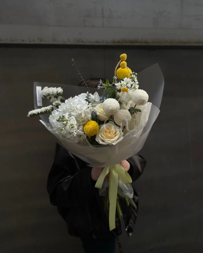 Маттиола добавляет лёгкий аромат, а твидия, статица и краспедия создают интересную фактуру и глубину. Нежный, живой и многослойный — для тонкого настроения и особенного повода 🌸