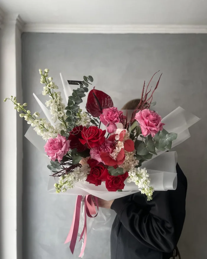 Антуриум придаёт композиции современный акцент, дельфиниум и маттиола добавляют воздушность и аромат, а гортензия — объём и нежность. Гривелия и эвкалипт, включая красный, подчёркивают фактурность и глубину оттенков, создавая яркий и запоминающийся образ.
