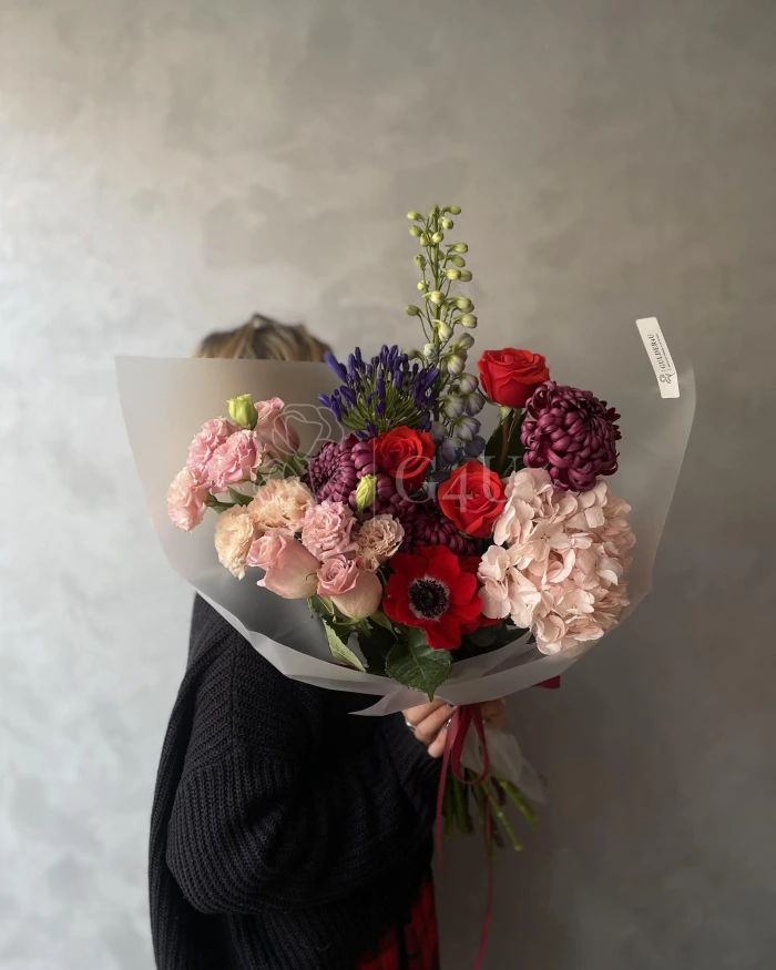 Букет «Gabrielle» — эффектная и утончённая композиция с розами и хризантемами, дополненная гортензией, агапантусом, анемоном и дельфиниумом.