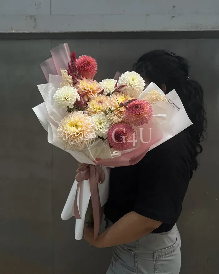 Букет "Ханна" — это стильная и современная композиция, объединяющая пышные георгины и утонченные сухоцветы.