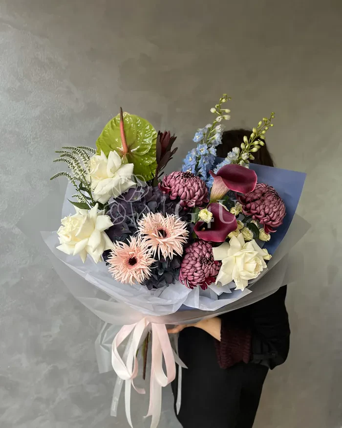 Состав: гортензии, Розы, хризантемы, маттиола, герберы, антуриум, спрей-розы, каллы