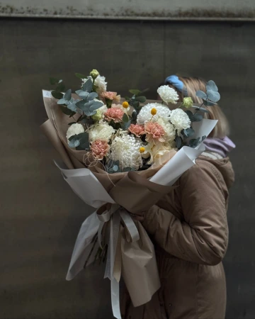 Георгины добавляют букету объём и насыщенные цвета, розы придают романтичность и классическую красоту, а лизиантусы вносят лёгкость и элегантность. Этот букет идеально подойдёт для создания особенного настроения, выражения искренних чувств и добавления нотки утончённой элегантности в любое событие.