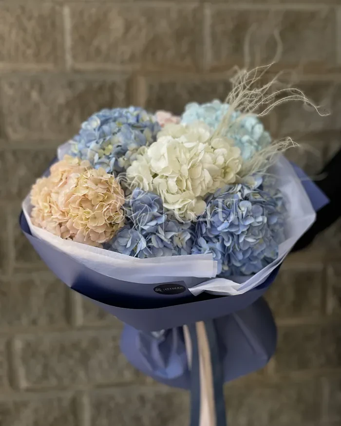 Этот состав создает яркое и стильное впечатление, подчеркивая красоту голубых оттенков гортензий. Идеально подходит для подарка или декора, придавая особый шарм синей элегантности.