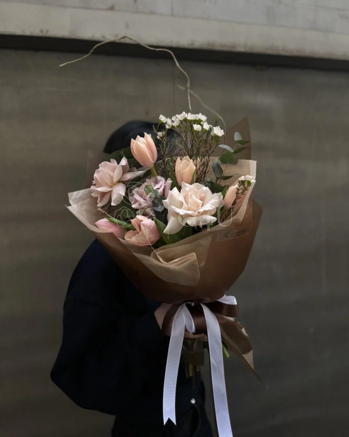 Изящные розы придают композиции глубину и романтику, тюльпаны добавляют свежесть и лёгкость, вакс наполняет букет воздушной текстурой, а эвкалипт подчёркивает естественность и благородство оттенков. Стильная упаковка завершает образ, делая букет гармоничным и эффектным. Идеальный выбор для трогательного признания, комплимента или красивого жеста внимания 💐