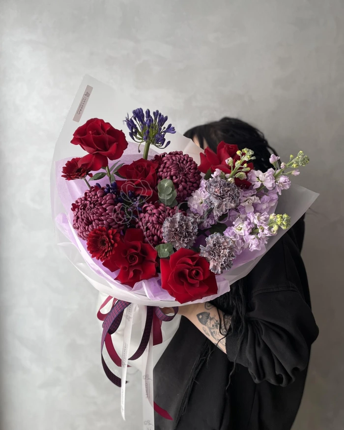 Букет «Martha» — сдержанная и уютная композиция из роз, хризантем и маттиолы с акцентами гвоздики, герберы и агапантуса.