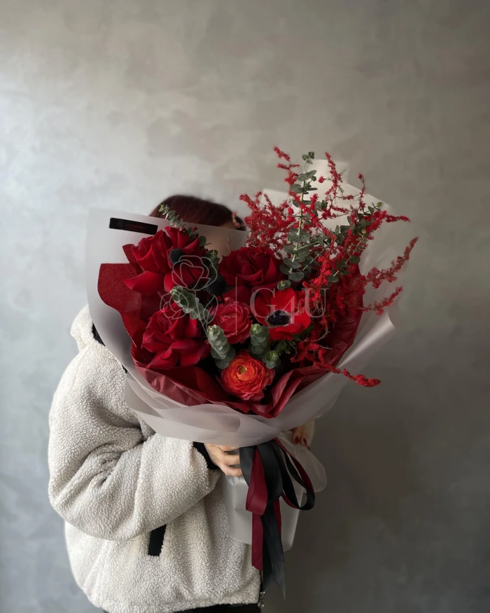 Розы создают чистую классическую линию, ранункулюсы и анемон добавляют выразительный акцент и глубину, а аспарагус придаёт лёгкость и живую фактуру. Эвкалипт завершает композицию свежим, спокойным настроением.