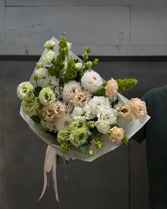 Георгины благодаря своим крупным и ярким цветкам добавляют в букет объем и насыщенные оттенки, создавая впечатление роскоши и элегантности. Лизиантусы, с их изящными и деликатными цветками, придают композиции лёгкость и воздушность, смягчая общее впечатление и добавляя изысканности. Вместе эти цветы формируют гармоничный и стильный букет, который идеально подойдёт для подарка на любое торжество или особое событие, подчёркивая его значимость и создавая атмосферу изысканности и красоты.