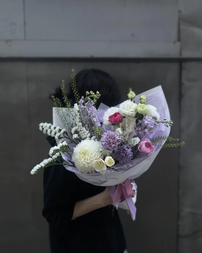 Гвоздики создают плотную основу, маттиола добавляет лёгкий аромат и воздушность, а ранункулюсы придают изысканность и нежную текстуру. Гармоничное сочетание делает букет стильным и выразительным подарком.