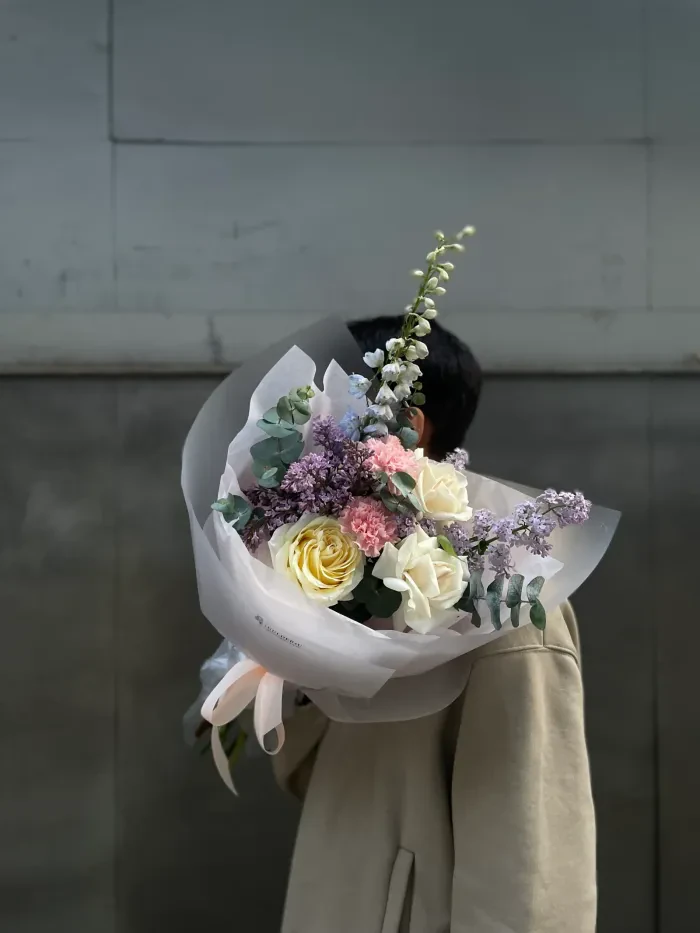 Букет "Поцелуй апреля" — утончённая весенняя композиция из роз, гвоздик и душистой сирени.