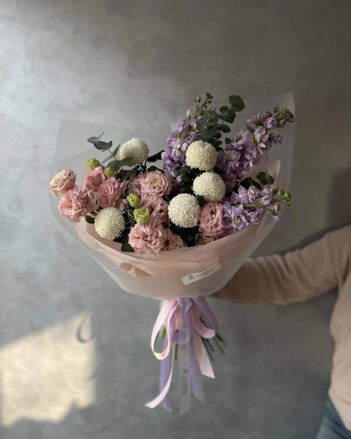 Букет «Scavo» — утончённая и мягкая композиция из хризантем и лизиантусов, дополненная ароматной маттиолой, нежной момокой и свежим эвкалиптом.