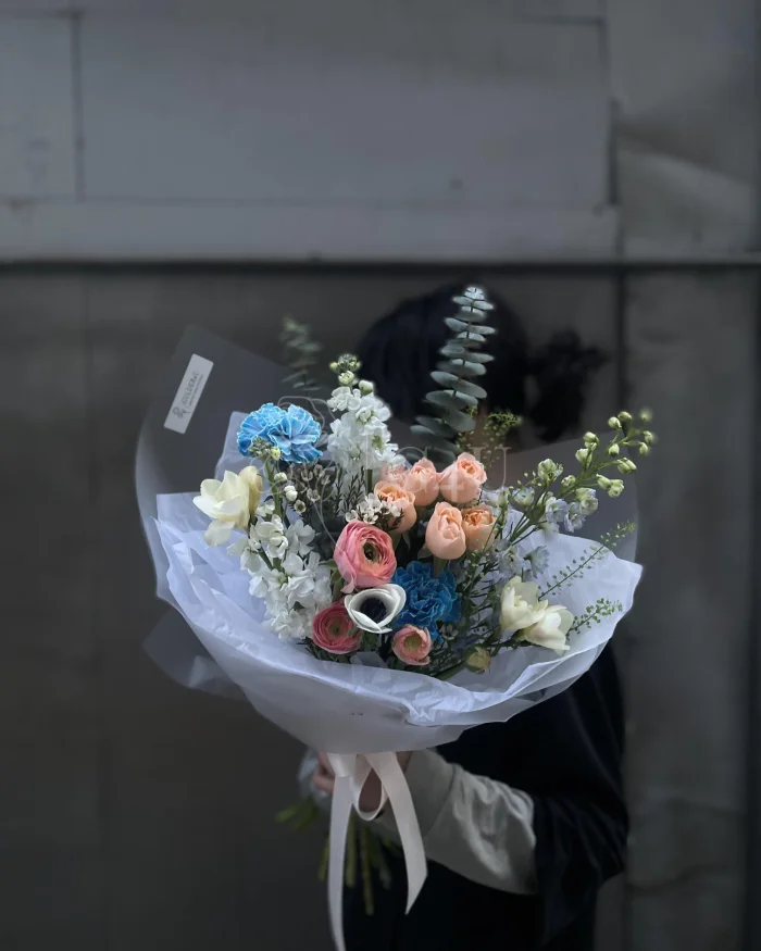 Состав: ранункулюсы, сухоцветы, эвкалипт, пионовидные спрей-розы, гвоздики, матиолла, вакс, дельфиниум, фрезии, грин белл, анемон
