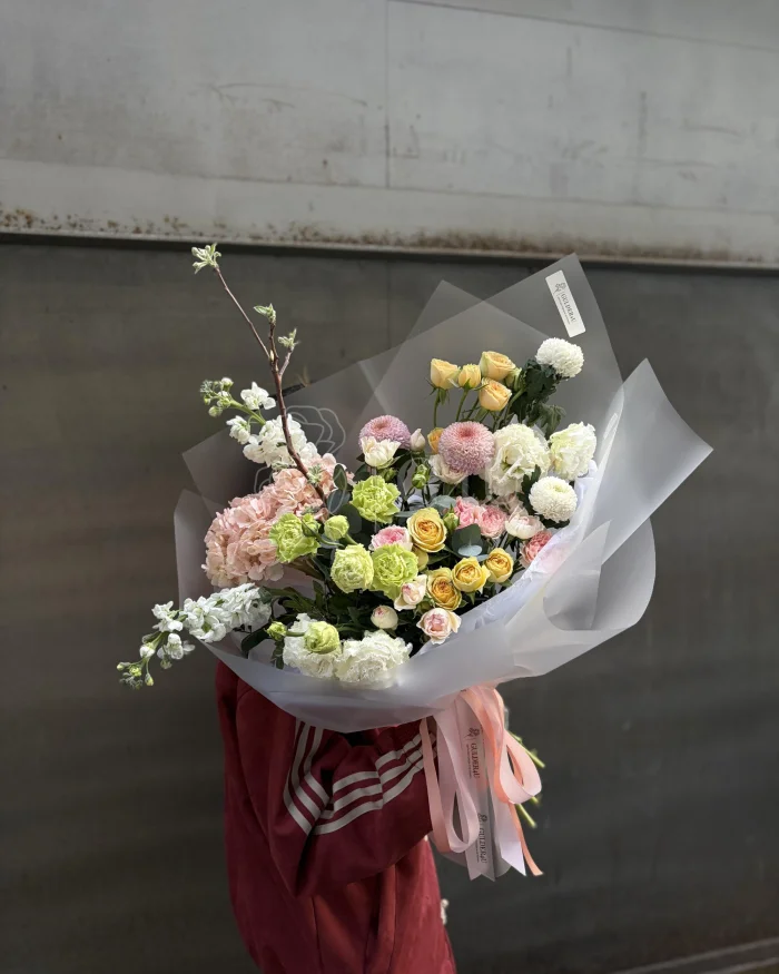 Спрей-розы создают лёгкость и романтичное настроение, гортензия и лизиантус добавляют объём и утончённость, а гвоздики придают мягкую текстуру. Маттиола наполняет букет деликатным ароматом, эвкалипт и декоративные акценты завершают образ свежестью и гармонией. Идеальный вариант для стильного и нежного подарка.