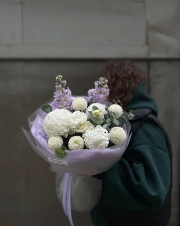 Букет "Susanna" — это элегантное сочетание нежных роз, воздушных хризантем и утонченных гвоздик, дополненное выразительными темными акцентами.