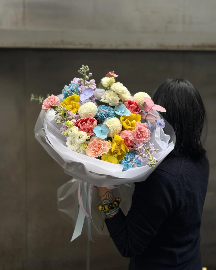 Нежная весенняя композиция в пастельной палитре с яркими акцентами. Воздушные тюльпаны и гвоздики создают мягкий объем, матиолла добавляет тонкий аромат, а розы Момока придают букету теплую глубину. Крашеный эвкалипт завершает образ легкой современной ноткой.
