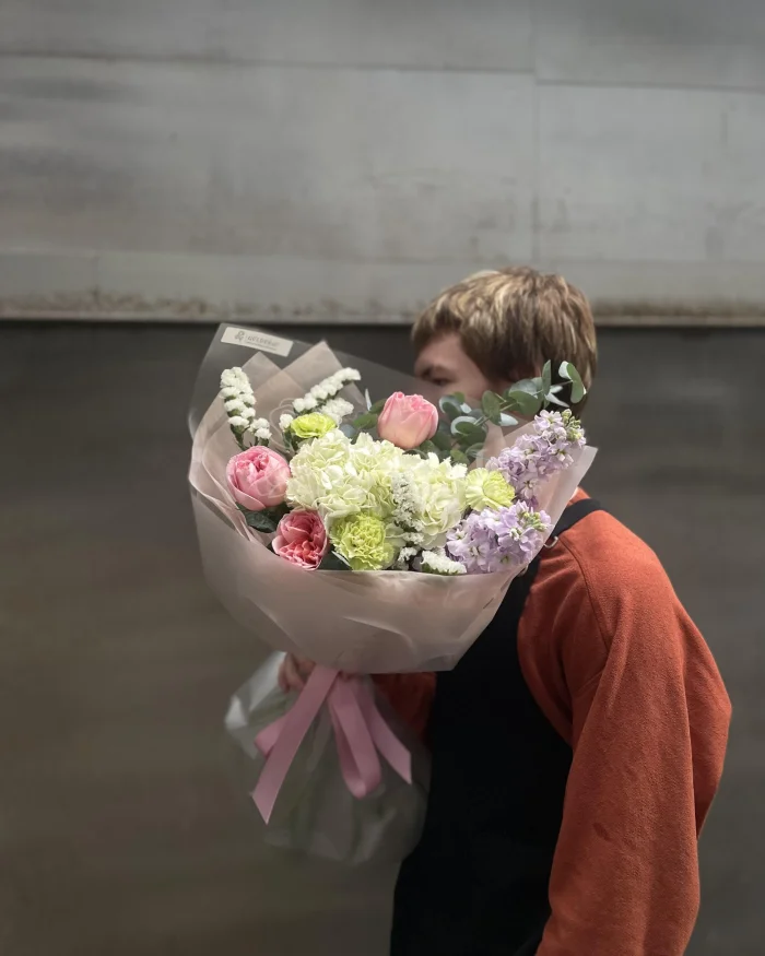 Пышная гортензия и пионовидные розы создают мягкую основу, гвоздики добавляют текстуру, а маттиола наполняет букет лёгким ароматом. Эвкалипт и статица завершают образ, придавая свежесть и воздушность.