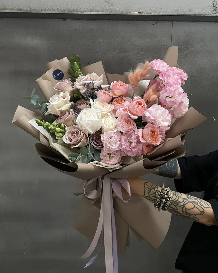 Состав: Розы, эвкалипт, пионовидные спрей-розы, роза квиксанд, сухоцвет лагурус, львиный зев, роза амнезия