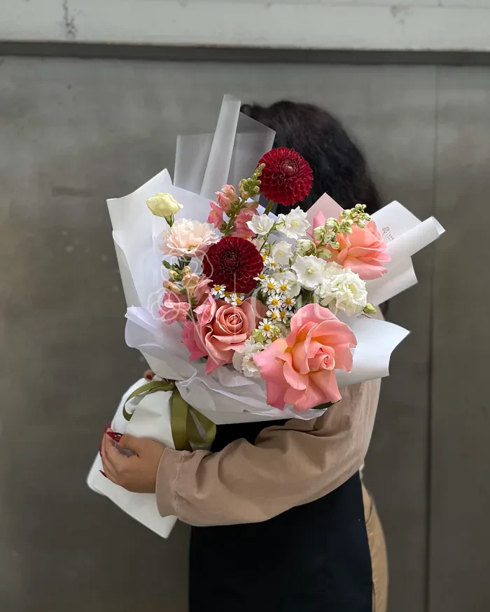 Букет "Улболсын" – это красивая и изысканная композиция, объединяющая в себе пышные георгины, элегантные розы и утончённые лизиантусы.