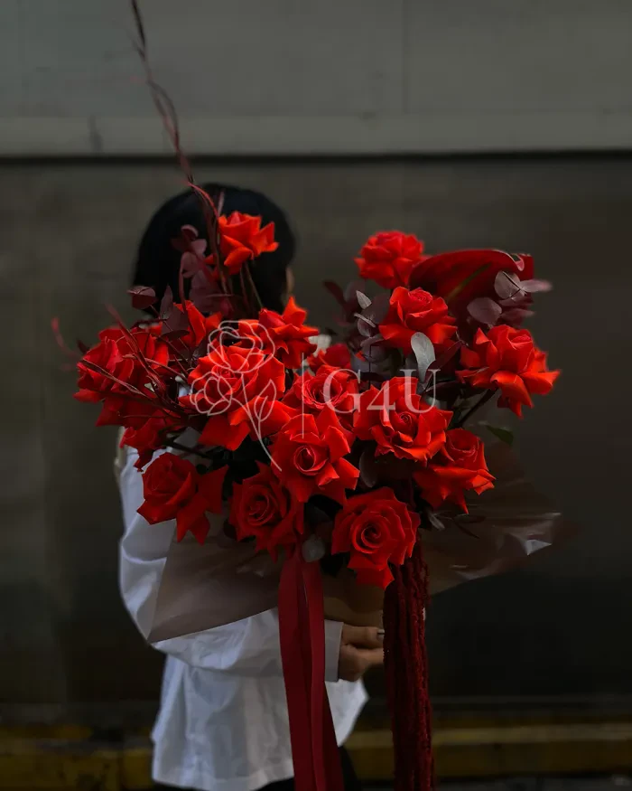 Состав: Розы, эвкалипт, амарант, антуриум, гравелия