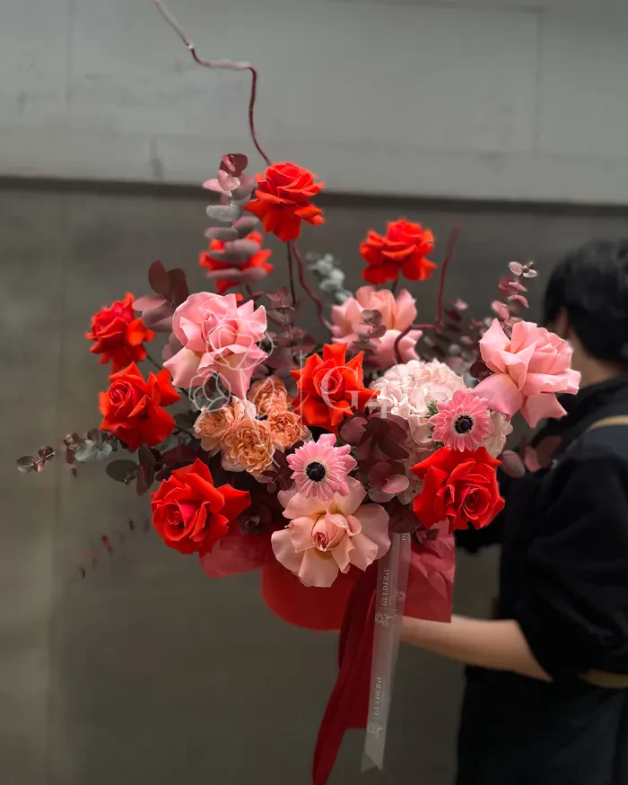 Букет в коробке "Rowena" — это изысканная композиция из пышной гортензии и благородных роз, собранная в элегантной шляпной коробке.