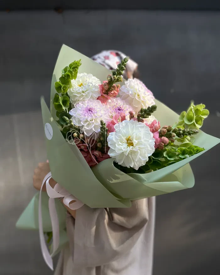 Георгины, с их пышными и изысканными лепестками, дарят ощущение свежести и элегантности. В этом букете собраны разноцветные георгины, от нежных пастельных оттенков до глубоких и насыщенных тонов, что придает композиции динамичность и живость. Этот букет идеально подойдет для любого случая, будь то праздник, день рождения или просто желание подарить хорошее настроение.