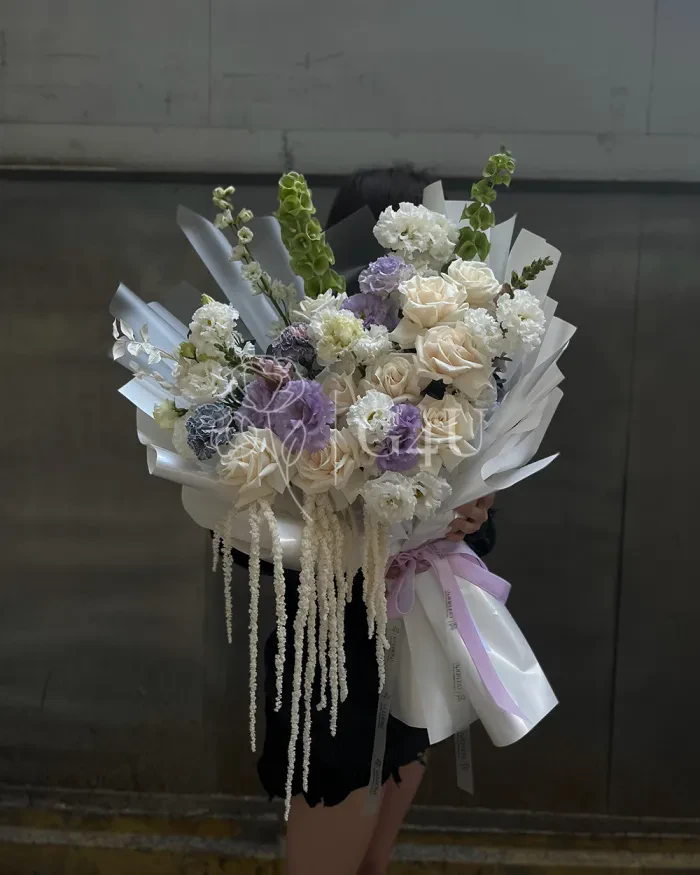 Лизиантусы добавляют букету мягкость и романтику своими нежными цветками, гвоздики придают элегантность и насыщенность, а молюцелла добавляет необычный акцент и свежесть. Этот букет идеально подойдёт для создания утончённого образа, подчеркивая индивидуальность и тонкий вкус дарителя.