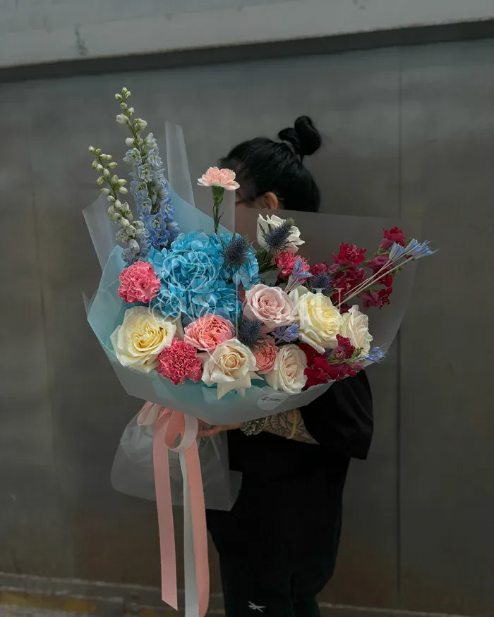 Розы символизируют любовь и восхищение, гвоздики добавляют изысканность и стойкость, а гортензии придают букету пышность и мягкость. Основные цвета букета – розовый, белый и нежно-голубой, создают гармоничную и романтичную палитру.