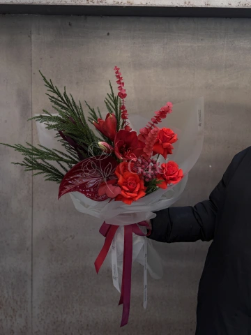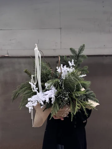 Главный акцент — луковица амариллиса, которая со временем разрастётся, превратившись в пышный, эффектный цветок. Такой подарок не только радует глаз сейчас, но и долго сохраняет праздничное настроение, постепенно раскрывая свою природную красоту и оживляя интерьер.