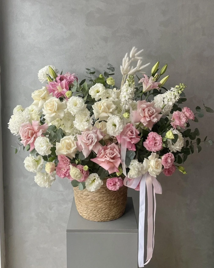 Розы и лилии задают торжественный акцент, лизиантус смягчает композицию своей нежностью, а эвкалипт добавляет свежесть и структуру. Сбалансированная, элегантная композиция, которая подчёркивает силу и уверенность, оставаясь утончённой и гармоничной.