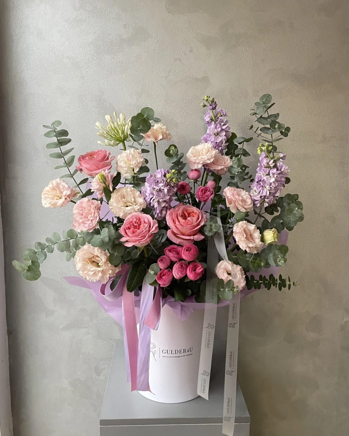 Композиция в коробке «Kayla» — нежная и воздушная композиция из пионовидных роз и маттиолы с утончёнными акцентами агапантуса, лизиантуса и спрей-роз.