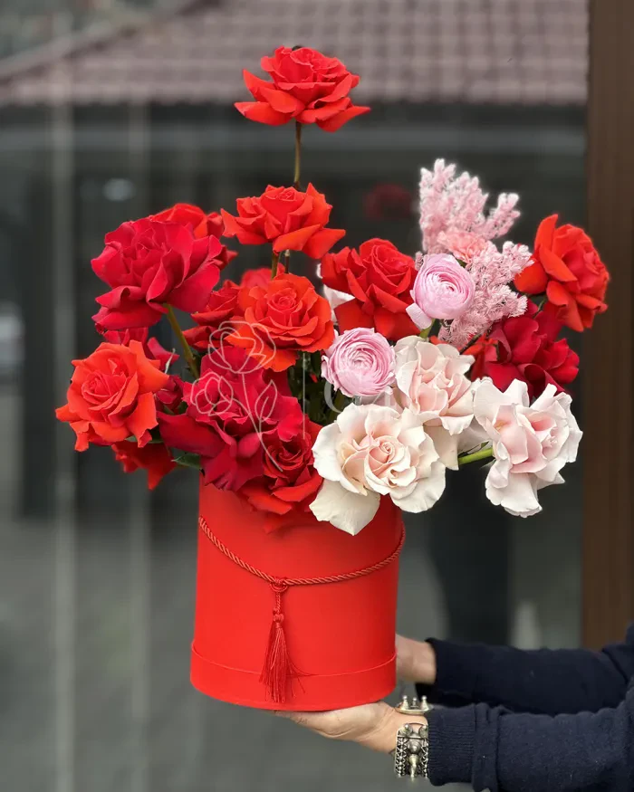 Сборная композиция из роз и ранункулюсов в красной коробке