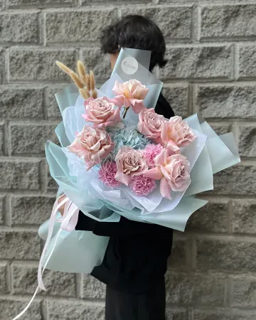 Состав: Розы, хризантемы, эвкалипт, пионовидные розы, амарант, гвоздика, брасика