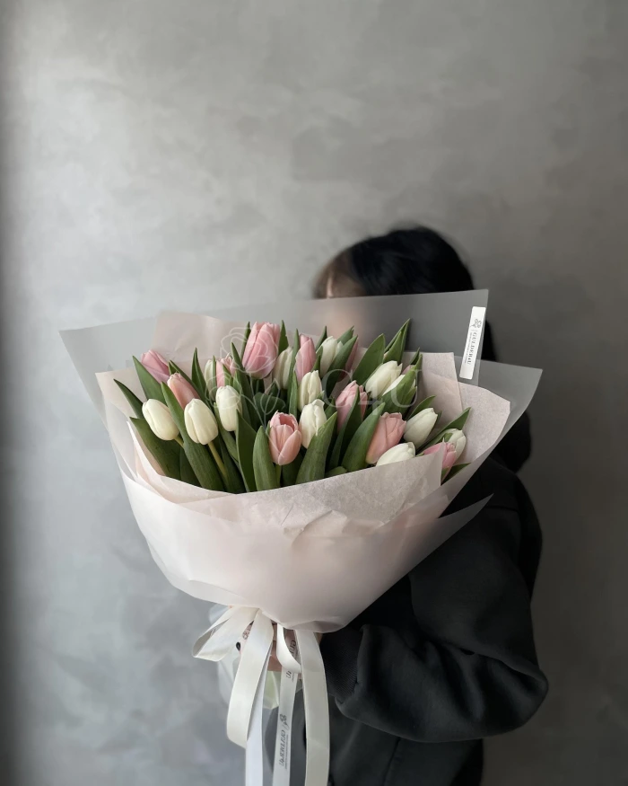 Моно букет из 25 тюльпанов — лаконичный и свежий.