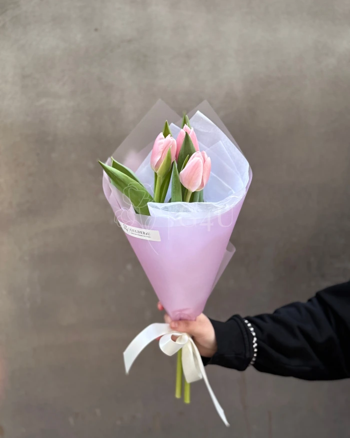 Моно букет из 3 розовых тюльпанов — нежная и утончённая композиция.