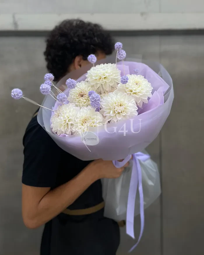 Георгины в фиолетовом оформлении могут варьироваться от насыщенных и глубоких тонов до более нежных и пастельных оттенков, что позволяет подобрать букет под конкретный стиль и настроение. Такой букет идеально подойдет для подарка на особый случай или для создания впечатляющего акцента в интерьере. Он дарит ощущение роскоши и таинственности, в то же время обещая радость и умиротворение своему получателю.