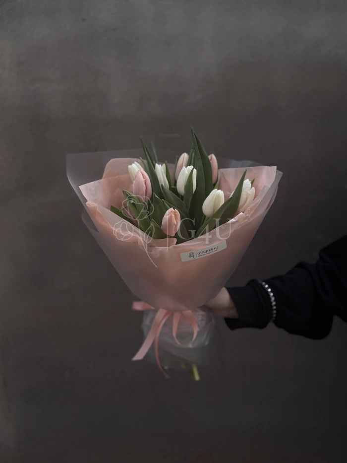Девять свежих тюльпанов создают пышный и выразительный акцент, подчёркивая естественную красоту и элегантность каждого цветка. Минималистичное оформление делает букет стильным и универсальным — для подарка, комплимента или праздничного настроения 🌷✨