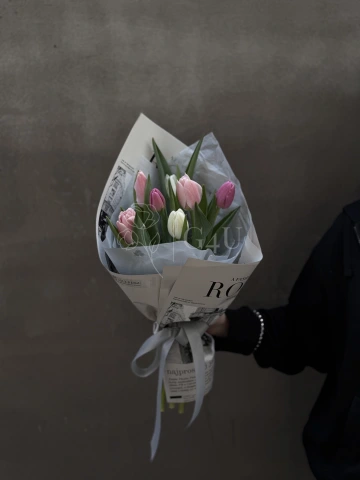 Девять свежих тюльпанов создают пышный и выразительный акцент, подчёркивая естественную красоту и элегантность каждого цветка. Минималистичное оформление делает букет стильным и универсальным — для подарка, комплимента или праздничного настроения 🌷✨