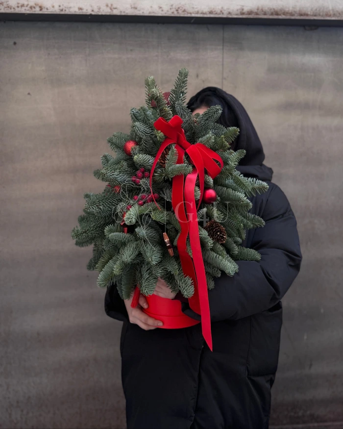 Новогодняя ёлочка «Frost Line» — минималистичная композиция из холодной хвои с графичными линиями и сдержанными зимними акцентами.