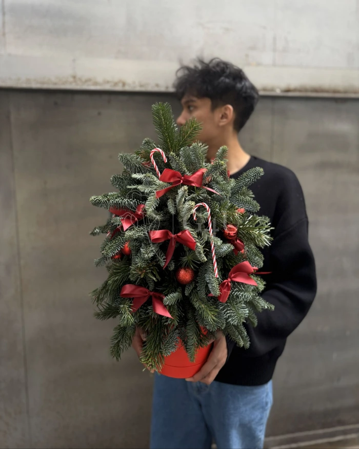 Новогодняя елочка "Ice Garden" в коробке – праздничная мини-елочка, аккуратно оформленная в коробке, украшенная яркими красными елочными игрушками и пышными красными бантами.
