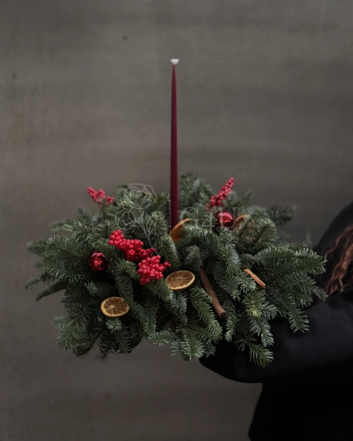 Новогодняя композиция "Arctic Grace" – праздничная композиция с красной свечой, украшенная дольками апельсина, палочками корицы и яркими красными ягодами.