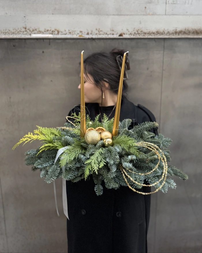 Новогодняя композиция "Polar Dream" – изысканная праздничная композиция с высокими свечами в подсвечниках, украшенная золотыми нитями и декоративными шарами разных размеров.
