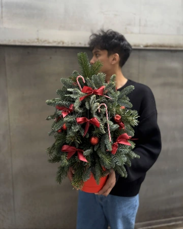 "Snowfall Bloom" – праздничная новогодняя композиция в коробке с пихтой, средним нобилисом, заснеженными ветками, крупными шишками, корицей, веточками с кристалликами и разнообразными шарами.
