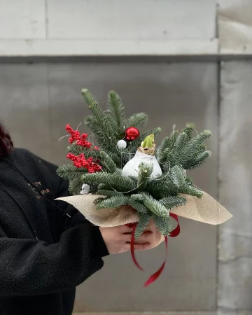 Новогодняя композиция «Свеча декабря» — праздничная зимняя аранжировка с крупной хвойной основой из нобилиса, сосны и эвкалипта.
