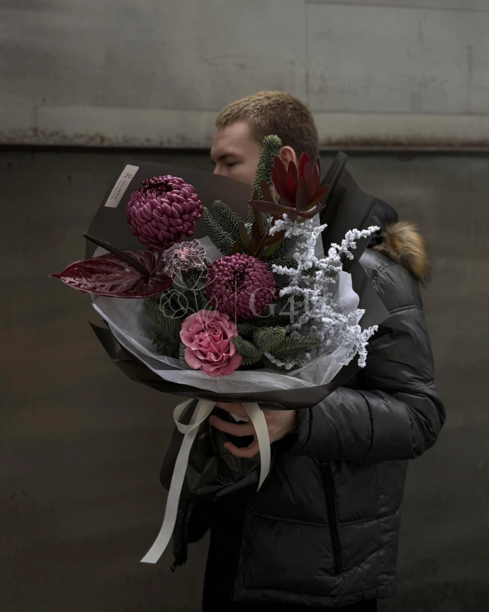 Благородный нобилис создаёт хвойную основу, хризантемы и гвоздика добавляют объём и стойкость, а пионовидная роза смягчает образ. Антуриум и элементы Safari вносят экзотический акцент, а заснеженная ветка подчёркивает праздничное, морозное настроение. Стильный букет с яркой индивидуальностью и новогодним шармом. ❄️✨