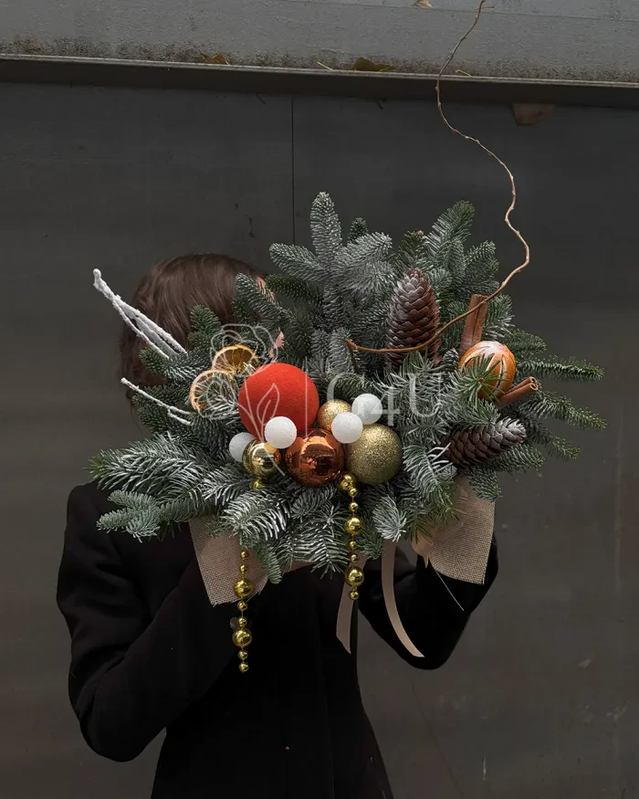 Новогодняя композиция "Ельфийская сказка" – изысканное сочетание пушистого нобилиса, сверкающих елочных игрушек, натуральных шишек, солнечных долек апельсина и переливающихся бус.