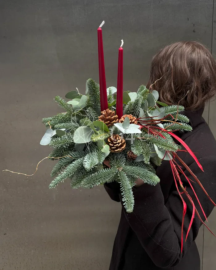 Новогодняя композиция "Ёлочные грёзы" — это изысканная композиция из нобилиса, веток, шишек, свечей и эвкалипта. Нежные зелёные оттенки хвои и эвкалипта гармонично сочетаются с природными элементами, создавая атмосферу уюта и тепла.